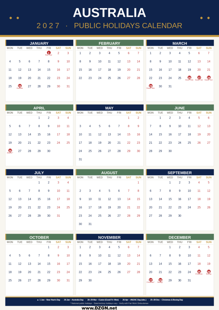 Yearly 2027 Australia Calendar with holidays